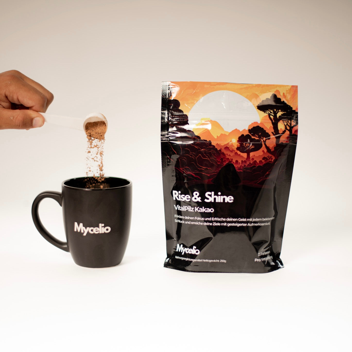 Und als ob das nicht schon genug wäre, enthält unser Vitalpilzkakao Rise & Shine auch Guarana, das nicht nur anregend wirkt, sondern auch positive Auswirkungen auf deine geistige Klarheit und Konzentration hat. Probier es aus und erlebe, wie unser Kakaogetränk dich auf natürliche Weise belebt und erfrischt.